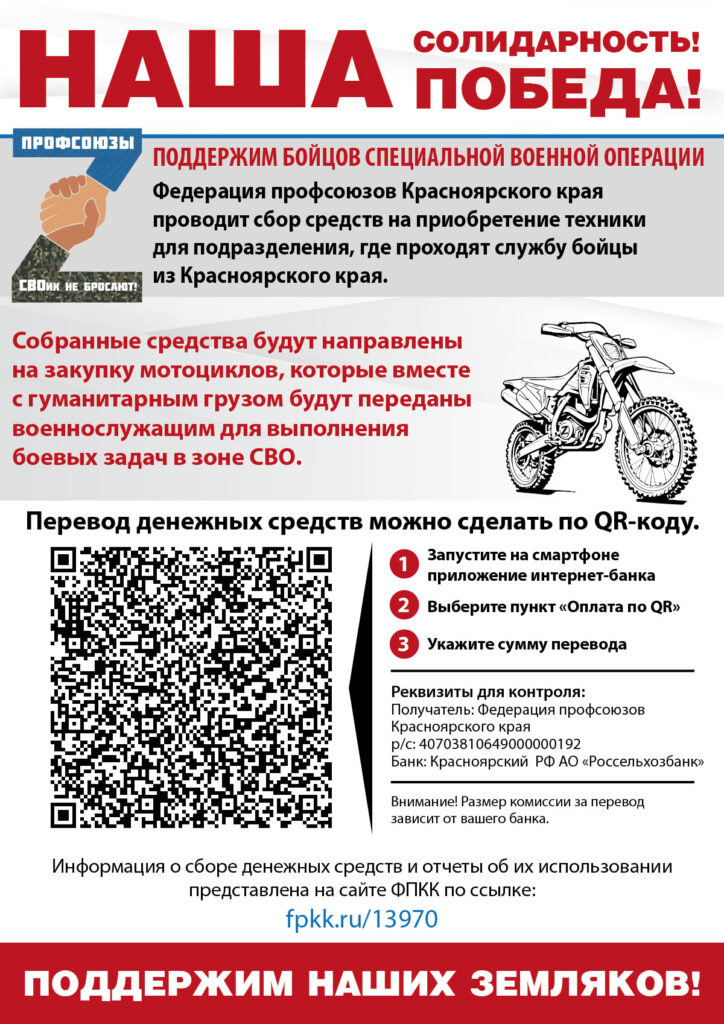 Федерация профсоюзов Красноярского края проводит сбор средств на приобретение техники для подразделения, где проходят службу бойцы из Красноярского края.