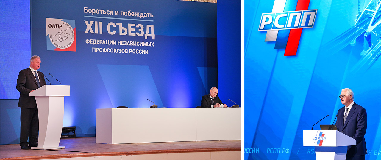 Прочной основой стали принципы социального партнерства государства, бизнеса и профсоюзов. Соответствующая норма, подчеркну, по инициативе профсоюзов теперь закреплена и в Конституции России. (…) Именно принципиальность сторон, открытость их позиций, понимание, что за каждым действием стоят интересы страны и миллионов наших граждан, является гарантией того, что решения принимаются взвешенно. Ну и в практической работе мы с председателем профсоюзов, Михаилом Викторовичем, в постоянном контакте по отдельным вопросам, которые представляют наибольший интерес для работников. Таким образом и соблюдается баланс интересов работников, бизнеса и государства.