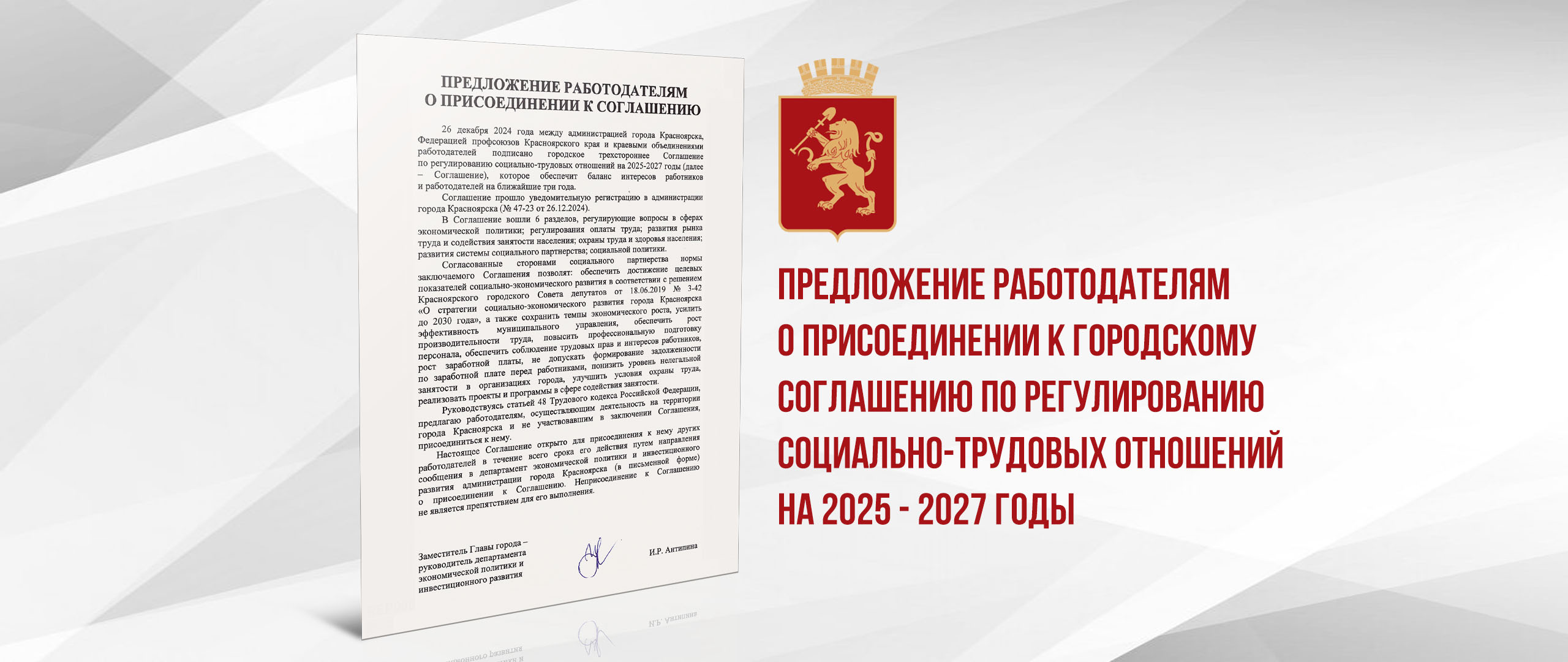 Соглашение по регулированию социально-трудовых отношений между администрацией города Красноярска, Федерацией профсоюзов Красноярского края и краевыми объединениями работодателей на 2025-2027 годы ( скачать .doc)