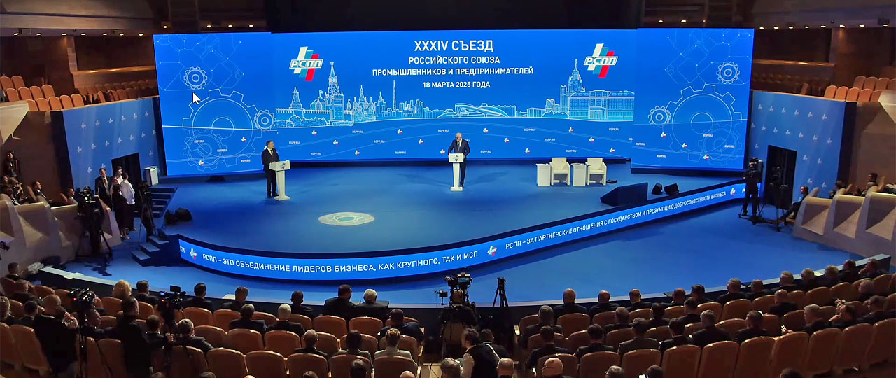 В работе съезда Российского союза промышленников и предпринимателей, состоявшегося 18 марта 2025 года, приняли участие президент России Владимир Путин и председатель Федерации независимых профсоюзов России Сергей Черногаев.