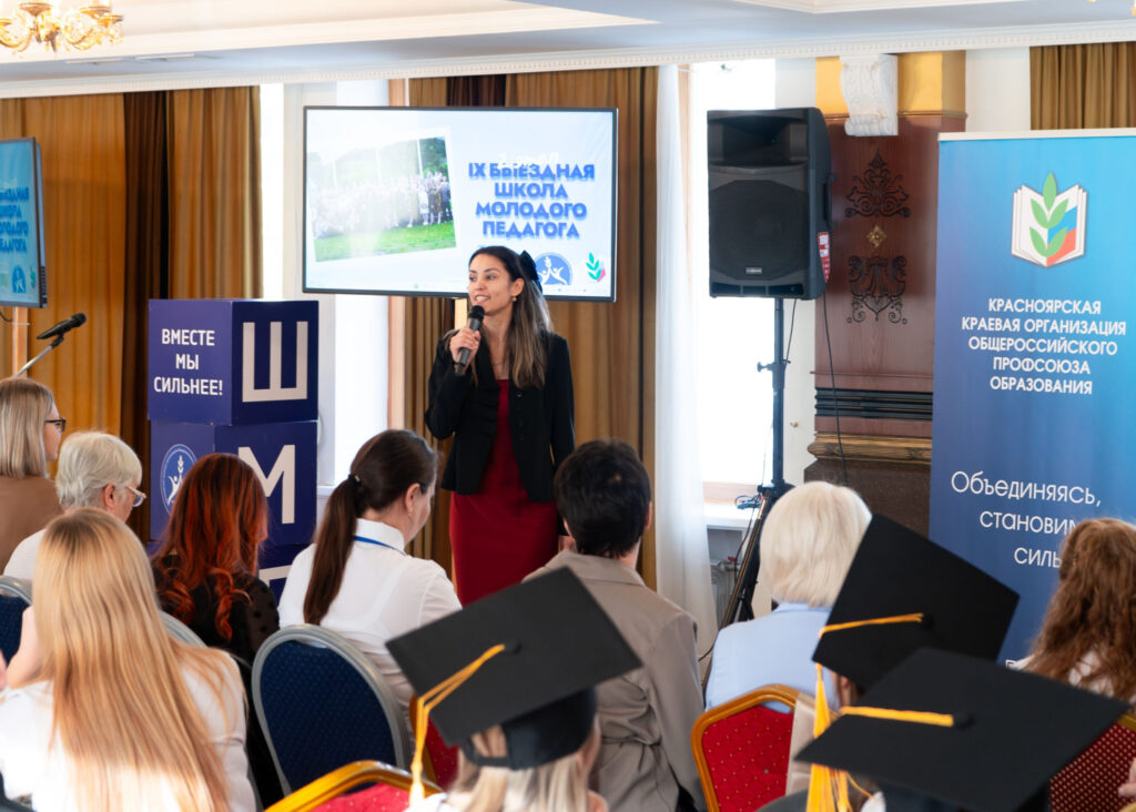 Дарья Теленченко, учитель Ирбейской школы №2, поделилась опытом организации здоровьесберегающего пространства для молодых педагогов, представив такие проекты, как мастер-класс “Динамические паузы для учителей” и летний интенсив “Экология души и тела на Ирбейской земле”. Интенсив проводится уже третий год и собирает не только молодых педагогов, но и их семьи. Такой формат позволяет обменяться опытом, провести время с коллегами в неформальной обстановке и побыть с семьями. Также в рамках мероприятия рассказывали о профсоюзной деятельности и принимали в свои ряды новых членов профсоюза.