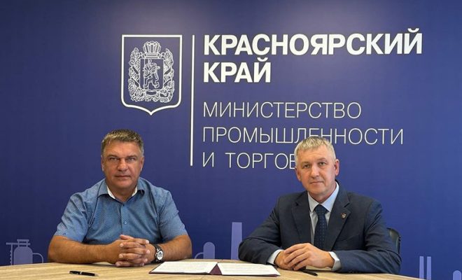 Председатель краевой организации профсоюза Андрей Евстигнеев и министр промышленности и торговли Красноярского края Максим Ермаков подписали соглашение о взаимодействии.