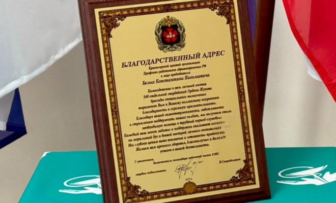 Благодарственным адресом от командования и всего личного состава 346-й отдельной гвардейской Ордена Жукова бригады специального назначения наградили Красноярскую краевую организацию Профсоюза работников здравоохранения РФ в лице ее председателя Константина Белых.